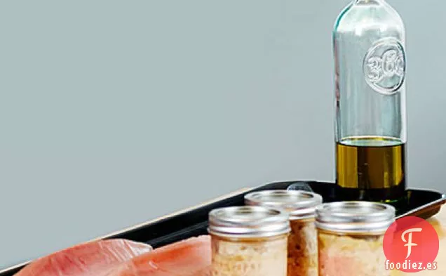 Coloque los medallones de atún cortados hacia abajo en cada frasco, rociando cada capa con aproximadamente 1/4 cucharadita. sal y una pizca de pimienta, dejando 1 en. espacio de cabeza entre el atún y la parte superior del frasco. Recorte el atún para que quepa si es necesario y use adornos para llenar cualquier espacio. Gire lentamente el frasco mientras mueve un cuchillo fino de plástico hacia arriba y hacia abajo alrededor del borde interior del frasco para liberar burbujas de aire.