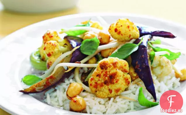 Retirar del fuego y dejar reposar 5 minutos. Espolvorear con un tenedor y reservar. Mientras tanto, mezcle el ajo, el jengibre, el aceite, la pasta de curry, la sal restante y 1/2 taza de agua. Mezcle con las berenjenas y la coliflor, luego transfiéralas a una sartén para asar, extendiéndolas en una sola capa. Ase hasta que estén tiernos, unos 30 minutos, revolviendo ocasionalmente.