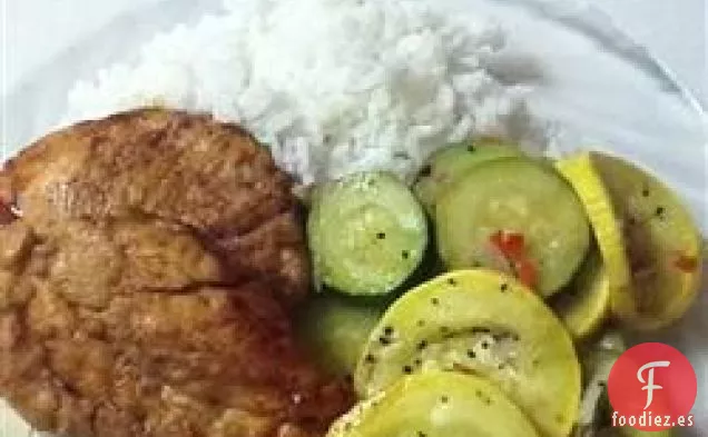 Combine la calabaza, el calabacín, la cebolla y el pimiento en un tazón; rocíe con aceite de oliva; espolvoree con el condimento de limón y pimienta; revuelva para cubrir.