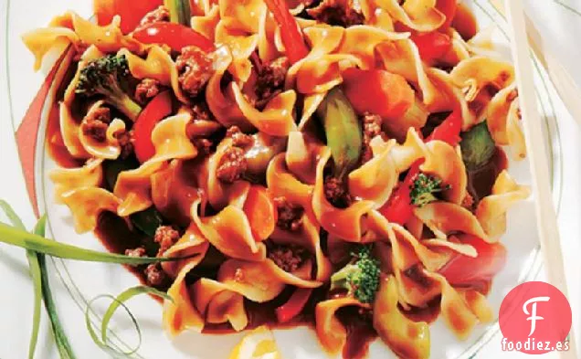 Agregue la mezcla de salsa y la pasta cruda (de la caja de ayuda para hamburguesas), el agua, la salsa de soja, la miel y el jengibre.