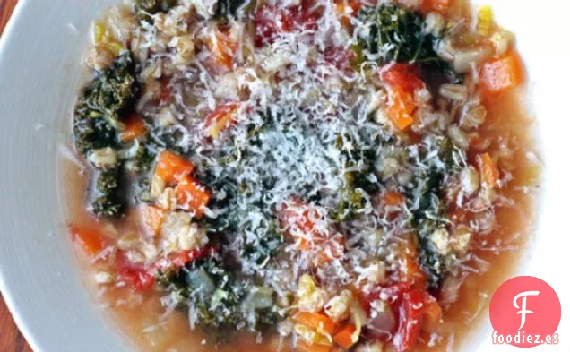 Agregue la col rizada y el tomate y cocine a fuego lento hasta que la col rizada esté tierna y el farro esté cocido, 20-25 minutos más. Sazone la sopa al gusto y sirva con queso parmesano rallado.