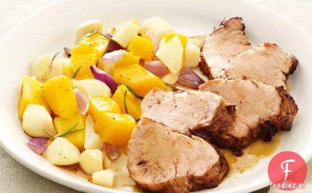 Mezcle la calabaza, las manzanas, la cebolla, la 1/2 cucharadita de ajo restante, la mostaza con miel y sal y pimienta al gusto en un tazón.