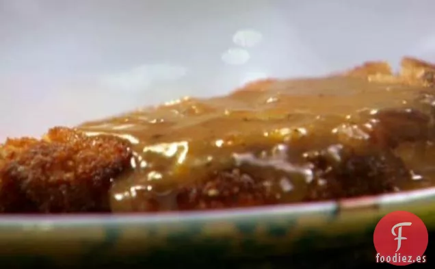 Caliente el aceite de oliva virgen extra, un par de vueltas de la sartén, en una sartén grande a fuego medio. Cocine las chuletas hasta que estén crujientes, de 3 a 4 minutos de cada lado. Coloque las chuletas en la bandeja para hornear con la rejilla y colóquelas en el horno para mantenerlas crujientes. A la sartén, a fuego lento, añadir la mantequilla y derretir.