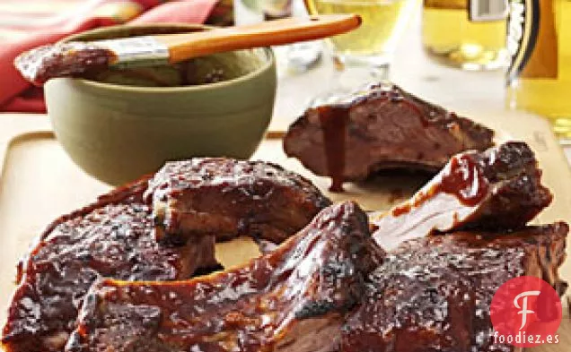 Escurre las costillas. Ase a la parrilla, tapado, a fuego medio durante 10-15 minutos o hasta que se dore, volteando y rociando ocasionalmente con salsa barbacoa.