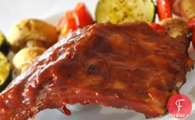 Unte las costillas con la mitad de la salsa de barbacoa. Asa en el horno precalentado hasta que la salsa se haya vuelto pegajosa y ligeramente dorada, aproximadamente 7 minutos. Voltea las costillas y unta con el resto de la salsa. Continúe asando hasta que la salsa se haya vuelto pegajosa, aproximadamente 7 minutos.