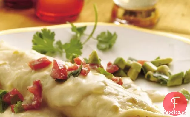 En un tazón mediano, mezcle los ingredientes restantes. Justo antes de servir, coloca la mezcla de aguacate en el centro de las enchiladas.
