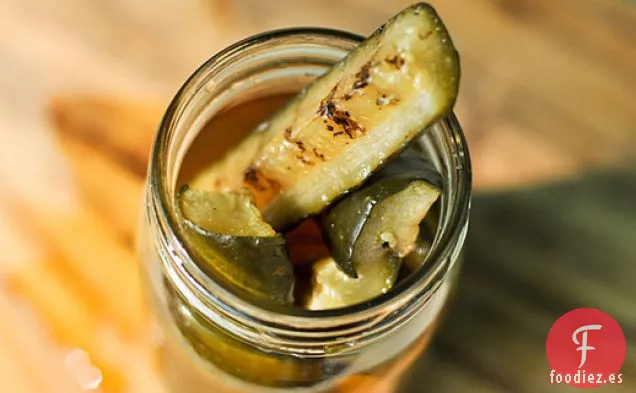 Coloque los pepinos y las cebollas en la parrilla. Cocine los pepinos hasta que estén ligeramente dorados por todos los lados, aproximadamente 2 minutos por lado. Cocine las cebollas hasta que estén carbonizadas por ambos lados y ligeramente ablandadas, aproximadamente 4 minutos por cada lado.