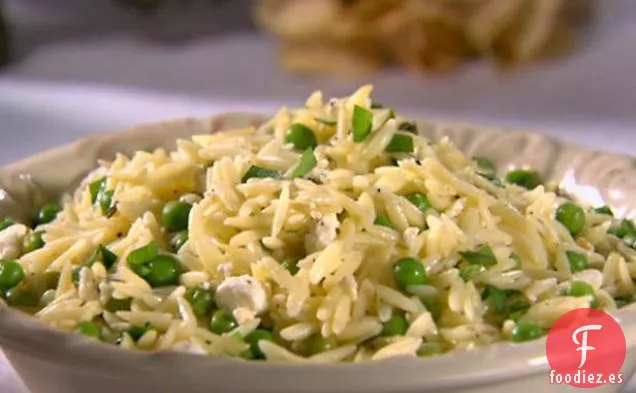 En una olla grande con agua hirviendo y con sal, cocine orzo según las instrucciones del paquete. Cuando el orzo esté al dente, retírelo del fuego y agregue los guisantes congelados al agua de cocción.