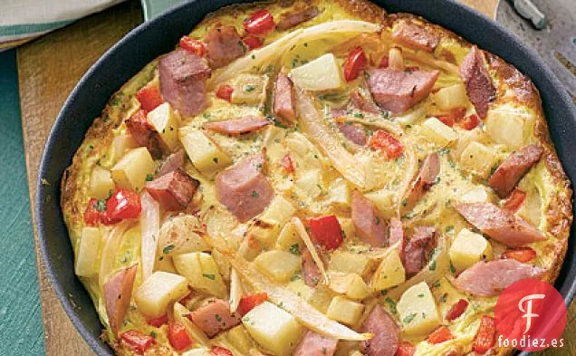 Mezcle los huevos, el jamón y el perejil; sazone la mezcla con pimienta. Distribuya las verduras de manera uniforme en la sartén y vierta la mezcla de huevo. Cocine a fuego medio-bajo, de vez en cuando deslizando una espátula delgada alrededor de los bordes de la sartén para aflojar los huevos a medida que se cuecen. Continúe cocinando hasta que la frittata esté cuajada, excepto por la parte superior, durante 7 minutos.
