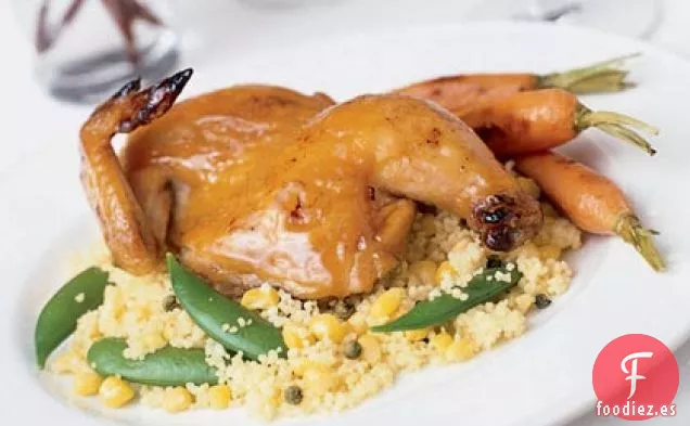 Gallinas glaseadas con Mostaza de Arce con Cuscús de Maíz y Guisantes