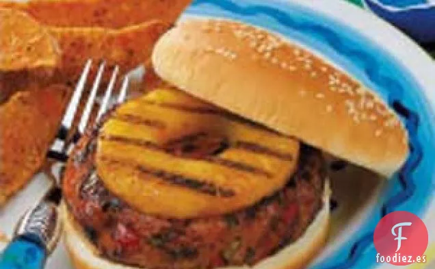 Asa las rodajas de piña durante 2 minutos por cada lado, rociándolas ocasionalmente con salsa teriyaki. Caliente los bollos en la parrilla; cubra cada uno con una hamburguesa y una rodaja de piña.