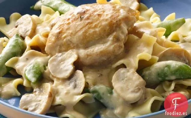Agregue los guisantes de azúcar. Cocine sin tapar de 3 a 4 minutos o hasta que el jugo de pollo esté transparente cuando se corte el centro de la parte más gruesa (180F) y los guisantes estén crujientes y tiernos.