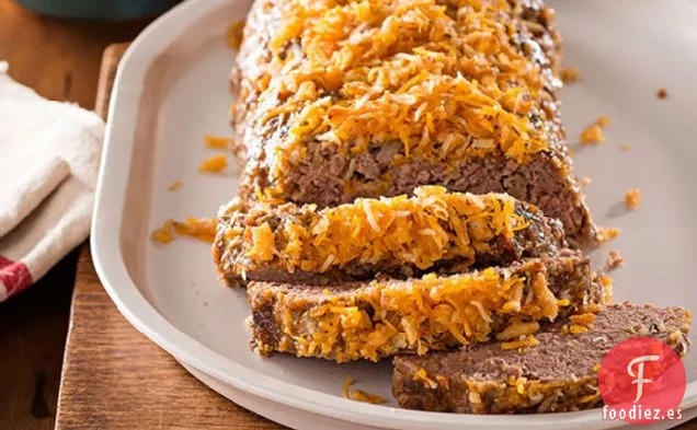 Hornear 1 hora. Cubra con el resto de las cebollas y el queso; hornee 10 minutos. o hasta que el pastel de carne esté listo (160F) y el queso se derrita.