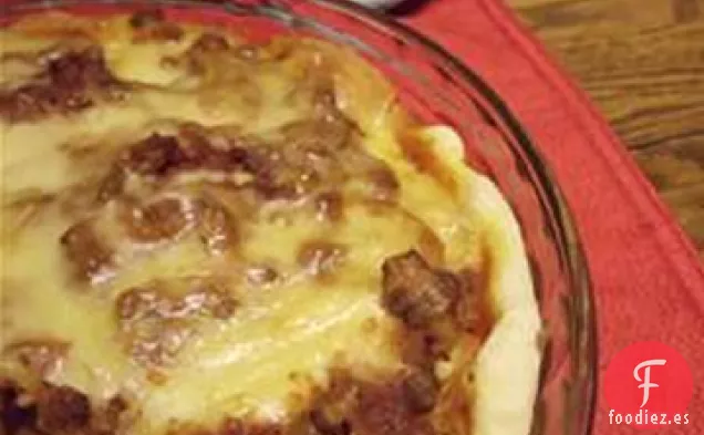 Esparza la mezcla de queso sobre la mezcla de espaguetis en la cáscara del pastel, esparza la salsa de carne sobre la mezcla de queso y cubra con 1/2 taza de mozzarella restante.