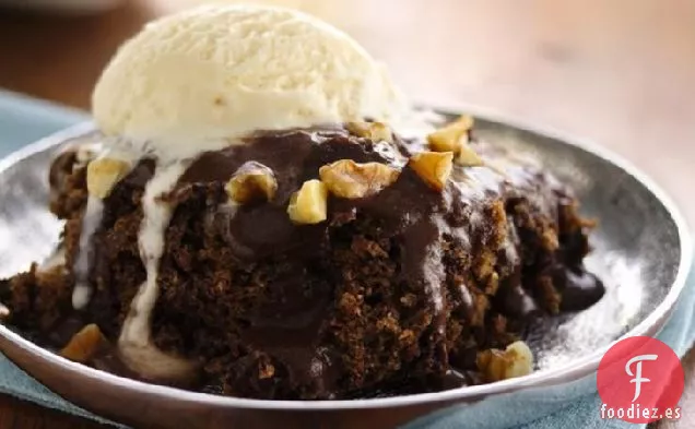 Hornea unos 40 minutos o hasta que la parte superior esté seca. Dejar enfriar 10 minutos. Coloca el pastel caliente con una cuchara en los platos de postre. Vierta la salsa de la sartén en cada porción. Cubra con helado; espolvoree con nueces.