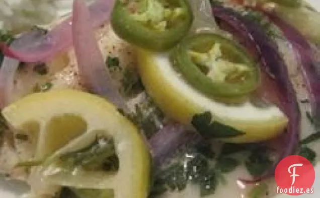 Coloque cada filete sobre una hoja grande de papel de aluminio. Cubra con rodajas de jalapeño y exprima el jugo de las puntas de los limones sobre el pescado. Coloque las rodajas de limón encima de los filetes. Selle con cuidado todos los bordes del papel de aluminio para formar paquetes cerrados.