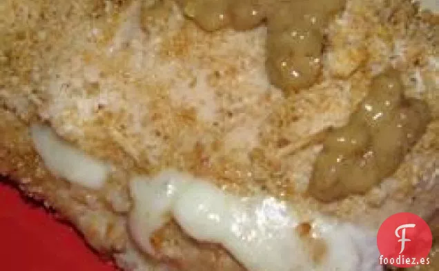 Coloque 1 media rebanada de provolone dentro de cada pollo, seguida de la mitad de las rodajas de manzana y una pequeña cantidad de chalota o cebolla, según sus gustos. Cubra con la mitad restante de provolone. Juntar el pollo de nuevo, espolvorear con una pequeña cantidad de leche y cubrir con pan rallado.