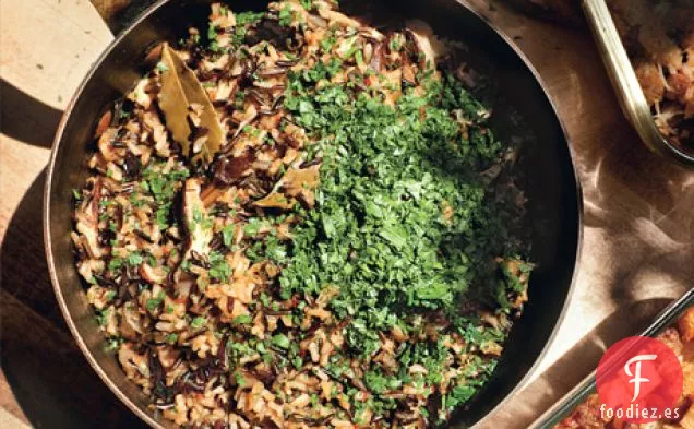 Agregue el arroz silvestre, el caldo, las hojas de laurel y 1 cucharadita de sal gruesa; lleve a ebullición. Reduzca el fuego a medio; tape y cocine a fuego lento hasta que todo el arroz esté tierno y se absorba el líquido, de 35 a 40 minutos. Mezcla de fluffrice con tenedor. Agrega los champiñones y el queso rallado. Sazone al gusto con más sal y pimienta. Revuelva brevemente a fuego medio hasta que esté caliente.