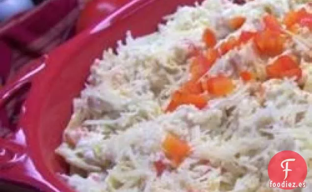 Saltee el puerro cortado en cubitos hasta que esté tierno. Agregue los corazones de alcachofa, los pimientos rojos asados, el queso parmesano y la mayonesa.