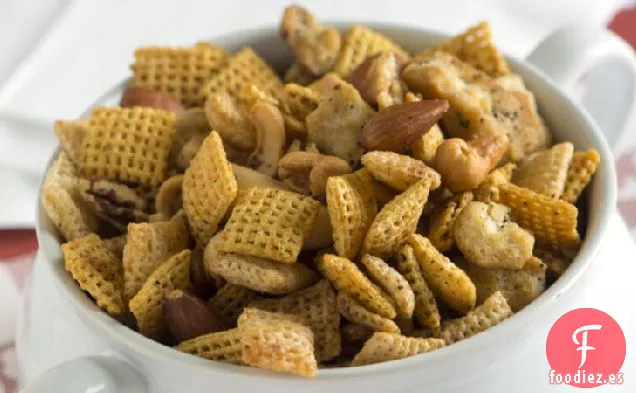 En un tazón grande para microondas, mezcle los cereales, los trozos de pretzel y las nueces.