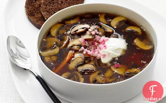 Divida la sopa entre tazones y cubra con crema agria y la cebolla marinada.